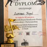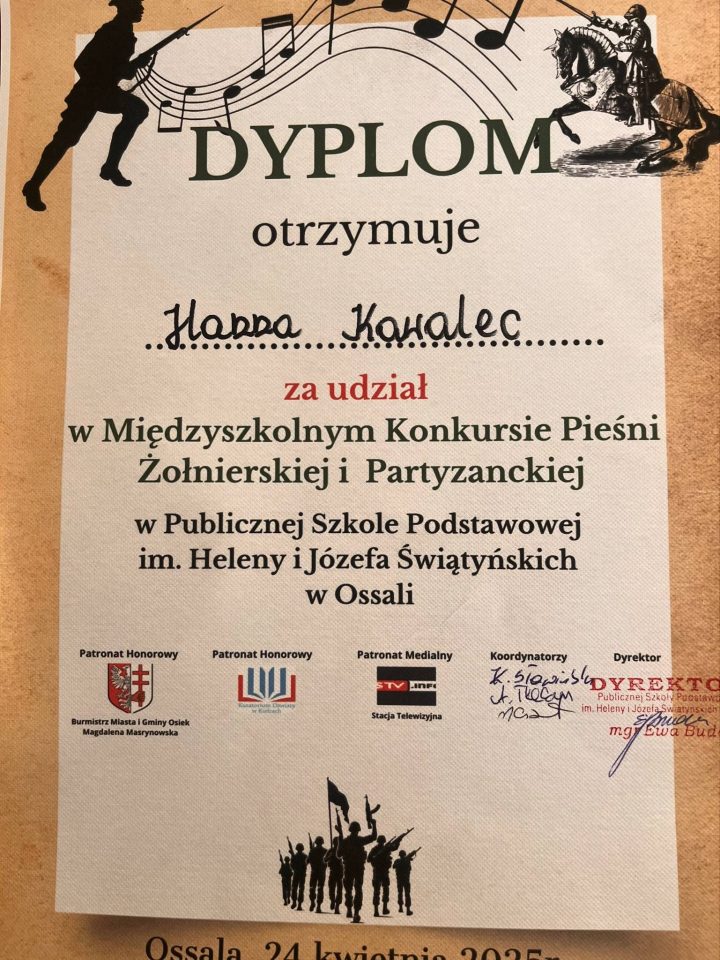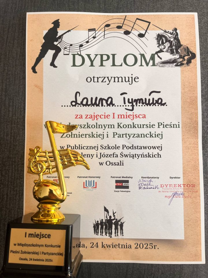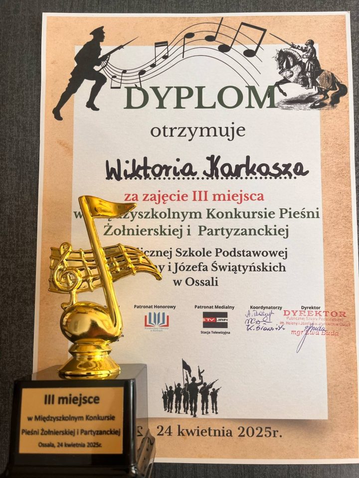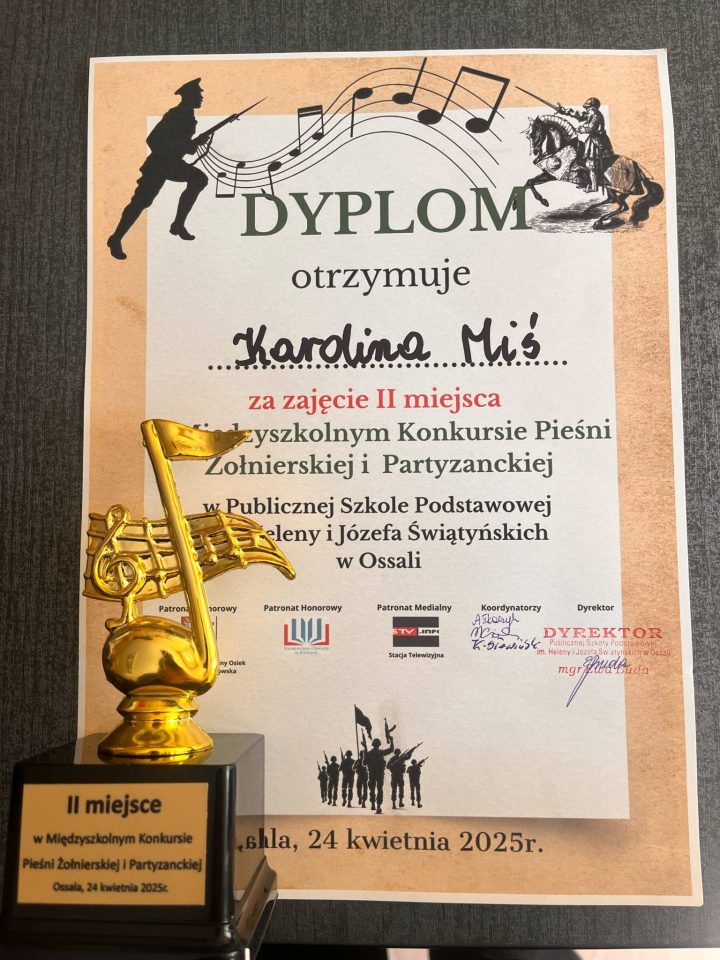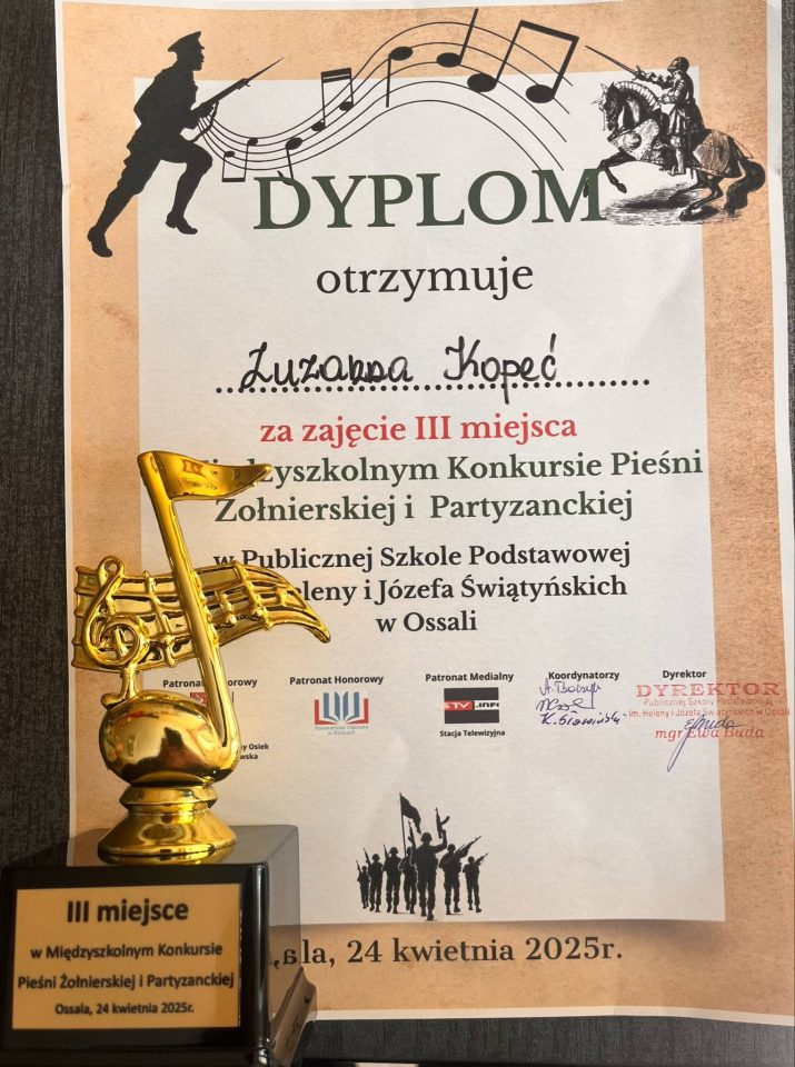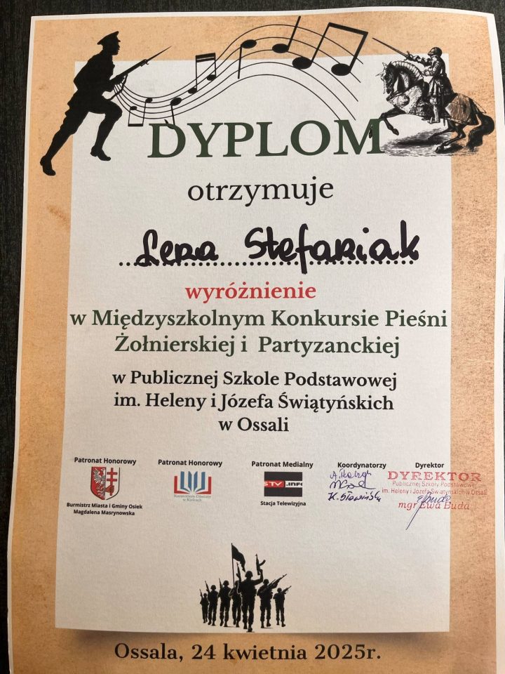 W czwartek 24 kwietnia 2025 r. sześć naszych utalentowanych uczennic wzięło udział w Konkursie Pieśni Żołnierskich i Partyzanckich, który odbył się w szkole w Ossali. O laury pierwszeństwa w trzech kategoriach rywalizowało 33. młodych artystów z 7 szkół. Nasze uczennice godnie reprezentowały szkołę i decyzją jurorów zajęły: