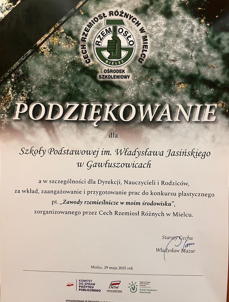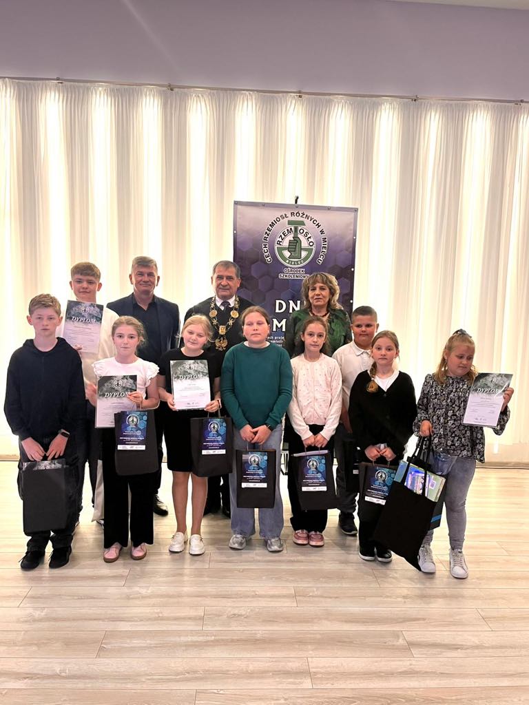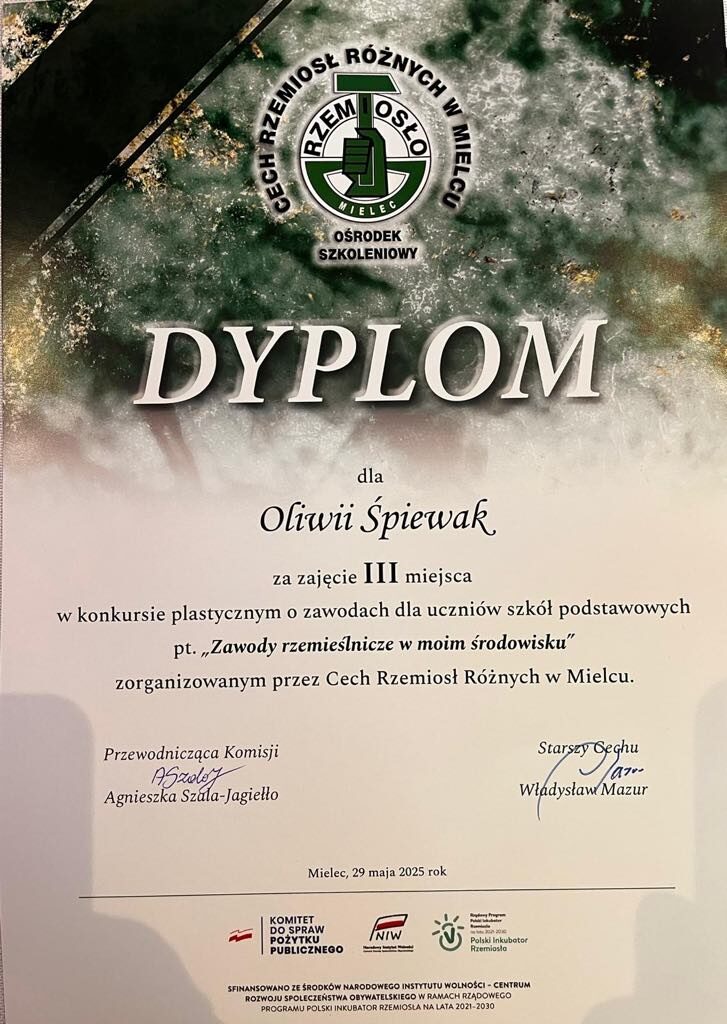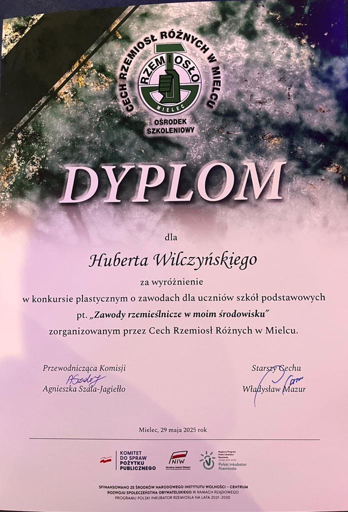 Uczniowie naszej szkoły wzięli udział w konkursie plastycznym pt. „Zawody rzemieślnicze w moim środowisku” zorganizowanym przez Cech Rzemiosł Różnych w Mielcu. Celem konkursu było: kształtowanie pozytywnego wizerunku rzemiosła i pracy zawodowej, popularyzacja zawodów rzemieślniczych, pogłębienie wiedzy i rozwijanie zainteresowań wśród młodzieży. Uczniowie angażując się w wykonanie prac konkursowych poznali różne zawody oraz zdobyli wiedzę o życiu społecznym i gospodarczym a także nabyli szacunek dla pracy innych. W konkursie wzięło udział 10 uczniów z naszej szkoły. Są to: Śpiewak Oliwia – kl.II b, Kopeć Zuzanna – kl. II b, Janeczek Zuzanna – kl. II b, Moryto Jagoda – kl. II b, Mazur Tadeusz – kl. II b, Kwaśnik Maksymilian- kl. IV, Dydo Zofia- kl.III, Burdzy Gabriela – kl. III. Sztuka Zuzanna – kl. IV, Wilczyński Hubert – kl.VII. Uczniowie wraz z Panem Dyrektorem i opiekunem Panią Lucyną Dec zostali zaproszeni na Dni Rzemiosła, które odbyły się 29 maja 2025 r.w restauracji Imperium w Mielcu. Podczas Dni Rzemiosła była możliwość zapoznania się z ofertami edukacyjnymi prezentowanymi przez lokalnych pracodawców, szkoły branżowe oraz Cech Rzemiosł Różnych w Mielcu. W czasie uroczystości wręczono nagrody uczestnikom konkursu.