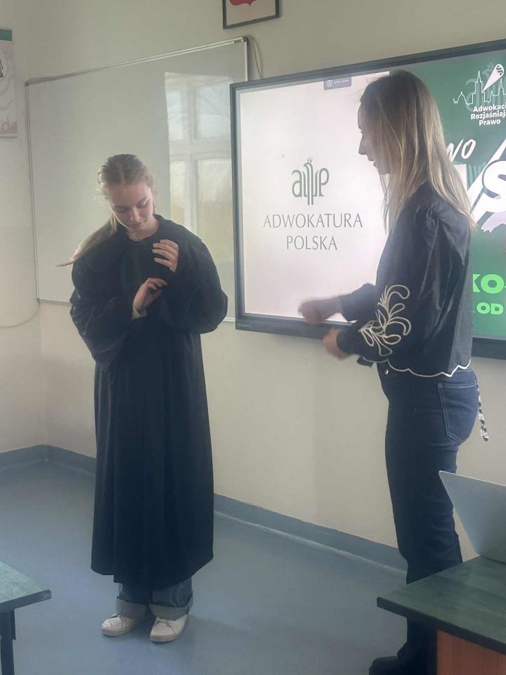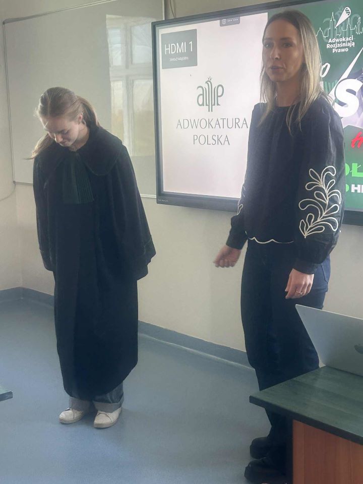 W dniu 21października 2025 r. uczniowie klas VII i VIII naszej szkoły uczestniczyli w niezwykle interesującym spotkaniu z panią adwokat Anną Pazdro, która przybliżyła młodzieży tajniki pracy prawnika oraz znaczenie prawa w życiu codziennym. Podczas spotkania uczniowie dowiedzieli się, na czym polega praca adwokata, jak wygląda droga do wykonywania tego zawodu oraz jakie predyspozycje są szczególnie ważne w tej profesji. Pani adwokat w przystępny i angażujący sposób opowiadała o podstawowych zasadach prawa karnego, cywilnego i rodzinnego, a także o sytuacjach, z którymi każdy może się zetknąć w życiu codziennym. Szczególne zainteresowanie wzbudziła część poświęcona odpowiedzialności prawnej małoletnich oraz bezpiecznemu korzystaniu z Internetu i mediów społecznościowych. Pani adwokat zwróciła uwagę, że nawet młode osoby ponoszą konsekwencje prawne swoich działań w sieci, zwłaszcza w sytuacjach związanych z hejtem, zniesławieniem, publikowaniem cudzych zdjęć bez zgody czy naruszeniem prywatności innych osób. Podkreśliła, jak ważne jest zachowanie kultury wypowiedzi, szacunek wobec innych użytkowników i rozwaga przy publikowaniu treści online. Dzięki praktycznym przykładom młodzież mogła lepiej zrozumieć, jakie skutki mogą mieć nieprzemyślane decyzje w Internecie i jak istotne jest świadome korzystanie z mediów cyfrowych. Spotkanie było nie tylko ciekawą lekcją o zawodzie prawnika, ale również ważnym doświadczeniem wychowawczym i obywatelskim. Uczniowie dowiedzieli się, że prawo to nie tylko przepisy, ale przede wszystkim zasady, które mają chronić każdego człowieka i kształtować odpowiedzialne postawy w społeczeństwie.