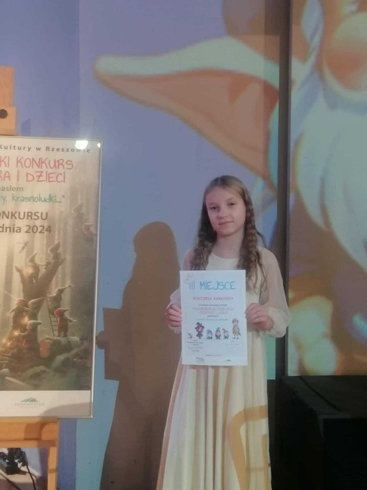Z przyjemnością informujemy, że uczennica klasy IV – Wiktoria Karkosza zajęła III miejsce w finale Podkarpackiego Konkursu Literatura i Dzieci pod hasłem „Duszki, skrzaty, krasnoludki… „, w kategorii piosenka. Jesteśmy dumni z naszej uczennicy. Serdecznie gratulujemy Wiktorii i życzymy dalszych sukcesów wokalnych.