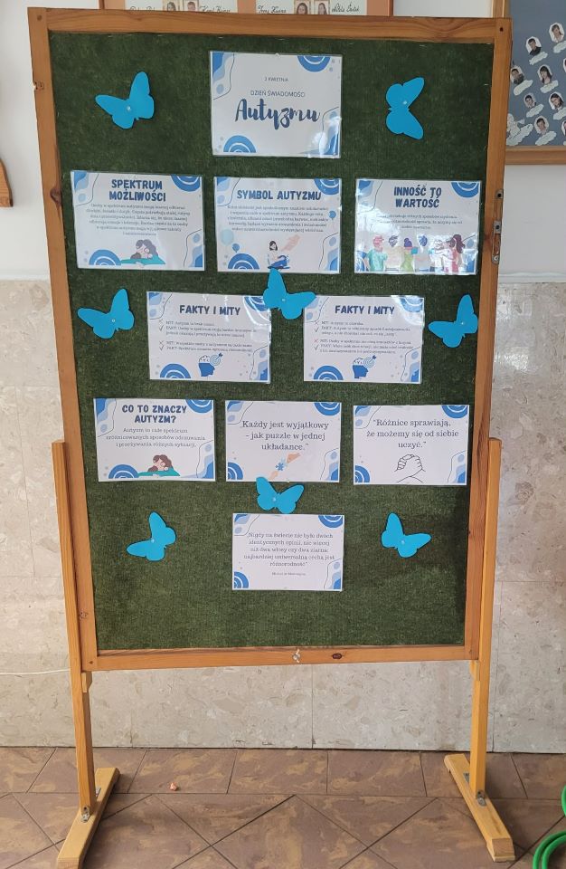 Na całym świecie 2 kwietnia obchodzony jest Światowy Dzień Świadomości Autyzmu, który został ustanowiony przez ONZ. Głównym przesłaniem tego dnia jest podnoszenie świadomości społecznej na temat spektrum autyzmu, zaś motywem obchodów jest kolor niebieski. 1 kwietnia w naszej szkole był dniem pełnym refleksji, wspólnej nauki i symbolicznego wsparcia dla osób w spektrum autyzmu. Uczniowie mieli okazję przypomnieć sobie ważne informacje na temat autyzmu, a także zdobyć nową wiedzę. Oglądali gazetki tematyczne, uczestniczyli w pogadankach, a także przygotowywali plakaty i prace plastyczne związane z tematyką dnia. Tego dnia cała szkoła zabłysła na niebiesko – kolor ten towarzyszył nam nie tylko w dekoracjach, ale także w strojach uczniów i nauczycieli. Pamiętajmy jednak, że świadomość autyzmu nie powinna ograniczać się do jednego dnia. To temat, który zasługuje na uwagę przez cały rok. Autyzm to codzienność wielu osób – budujmy świat, w którym każdy czuje się akceptowany, zrozumiany i szanowany, niezależnie od swojej różnorodności. Dzielmy się wiedzą, otwierajmy serca i bądźmy świadomi – nie tylko 2 kwietnia, ale każdego dnia. Przygotowały: Kamila Ferenc, Bożena Reczko