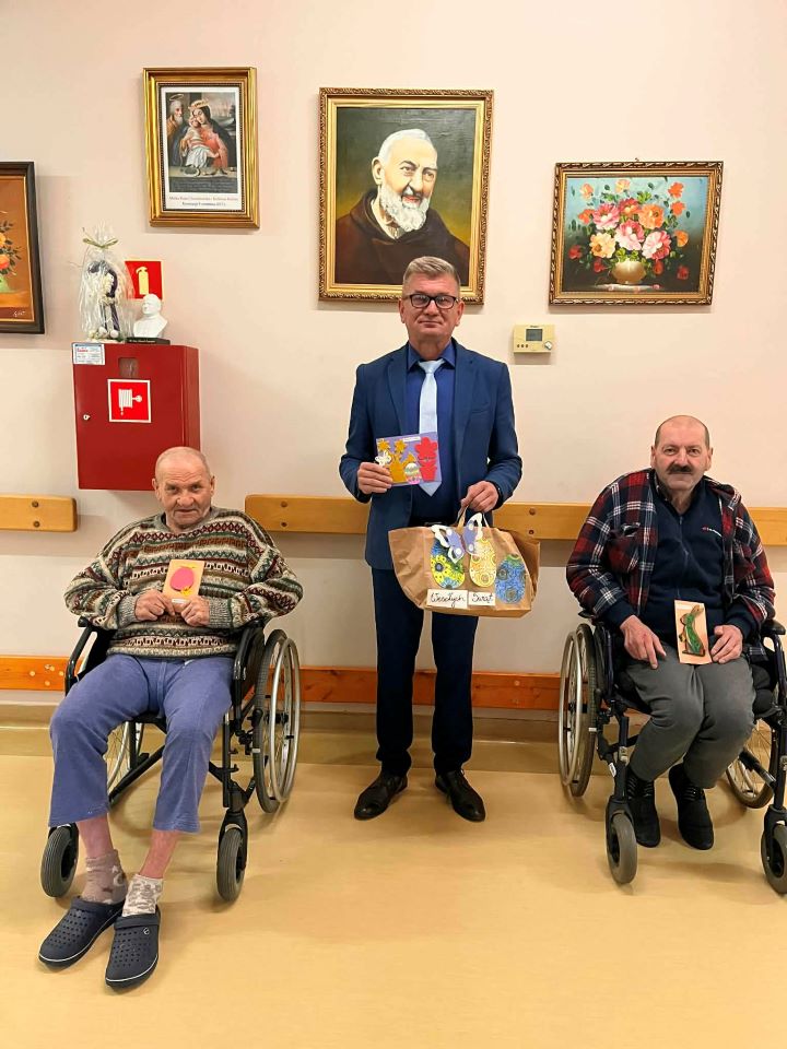 Jak co roku uczniowie naszej szkoły wykonali kartki dla pacjentów i podopiecznych z ZPO w Rożniatach, a także dla seniorów z Dziennego Domu Pomocy i Klubu Seniora w Brzyściu, czyli Stowarzyszenia Razem Tworzymy Dobro. W robienie tych kartek byli zaangażowani uczniowie, którzy przychodzą do biblioteki w ramach zajęć opiekuńczo – wychowawczych, a także grupy przedszkolne: „Misie”, „Smerfy” oraz „Tygryski”. Młodsze dzieci malowały kolorowanki, które później posłużyły do wykonania poszczególnych kartek. Następnie w dniu 31 marca br. Pan Dyrektor naszej szkoły – Grzegorz Nelec zawiózł te prace uczniów i złożył życzenia w imieniu własnym, nauczycieli, pracowników i uczniów podopiecznym z  ZPO w Rożniatach, a także dla seniorów z Dziennego Domu Opieki w Brzyściu. Sądzimy, że u obdarowanych pojawił się uśmiech, a Święta będą bardziej kolorowe. Oprac.: A. Głodzik